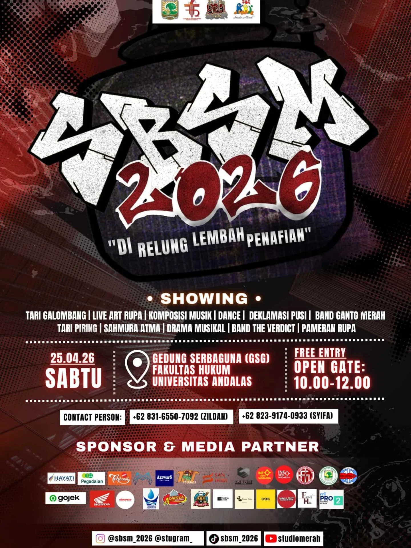 Sehari Bersama Studio Merah (SBSM) 2026 merupakan kegiatan seni dan kreativitas mahasiswa Fakultas Hukum Universitas Andalas yang menjadi ajang pembuktian karya sekaligus bagian dari tugas akhir mahasiswa Jurusan Hukum.