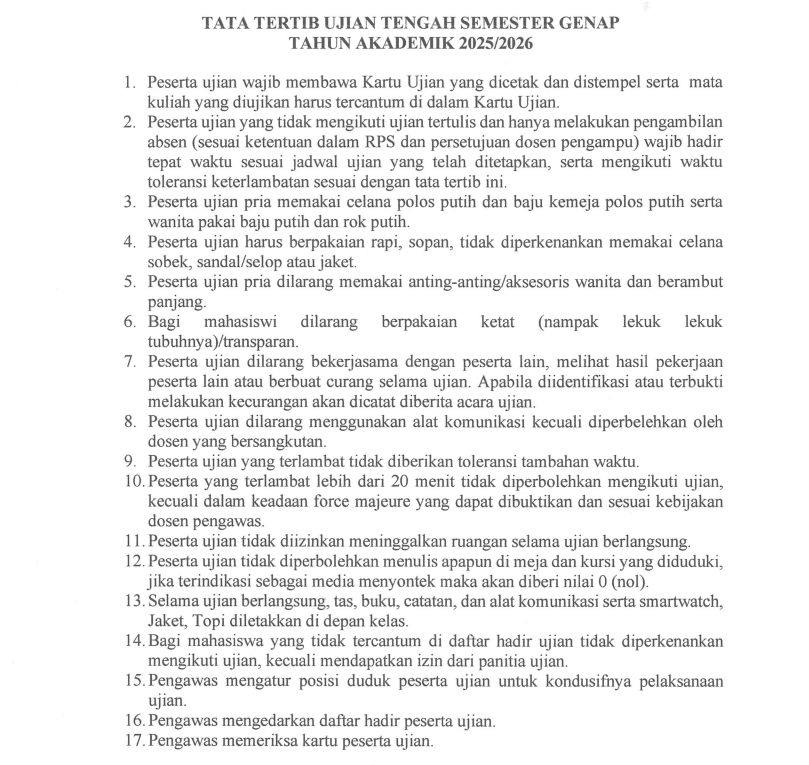 Diharapkan seluruh mahasiswa dapat mematuhi ketentuan dan tata tertib yang telah ditetapkan demi kelancaran, ketertiban, serta integritas pelaksanaan Ujian Tengah Semester.